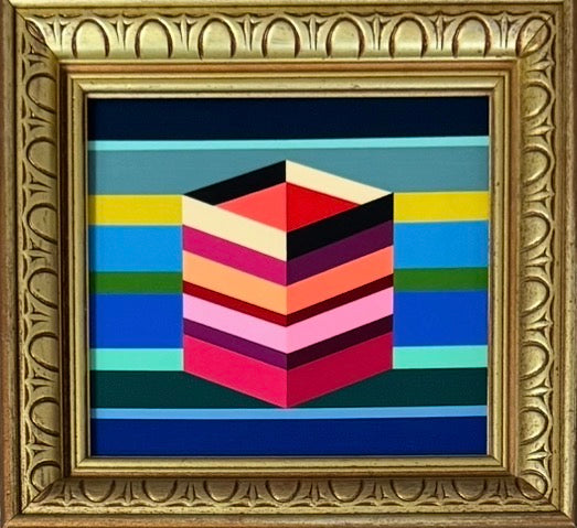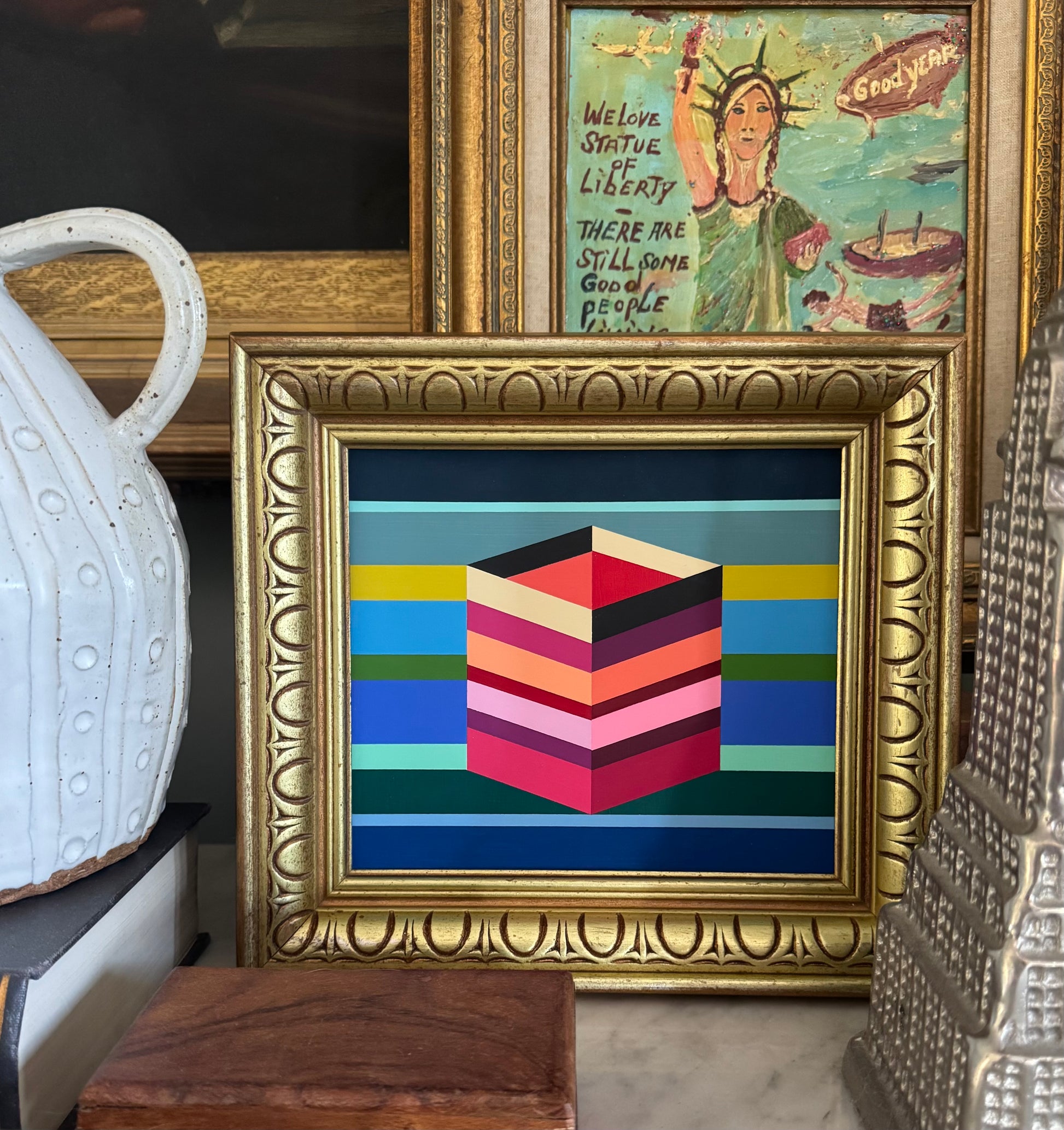 Striped geometric, abstract, painting. Acrylic on 1/4 inch wood panel framed in a collected vintage frame.