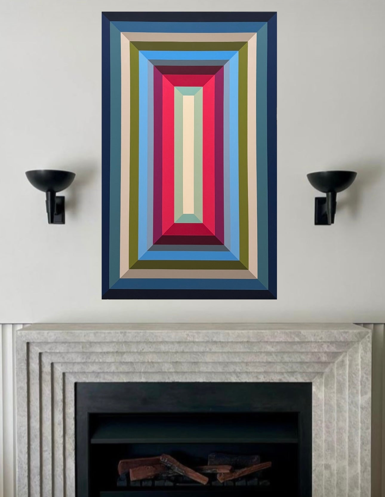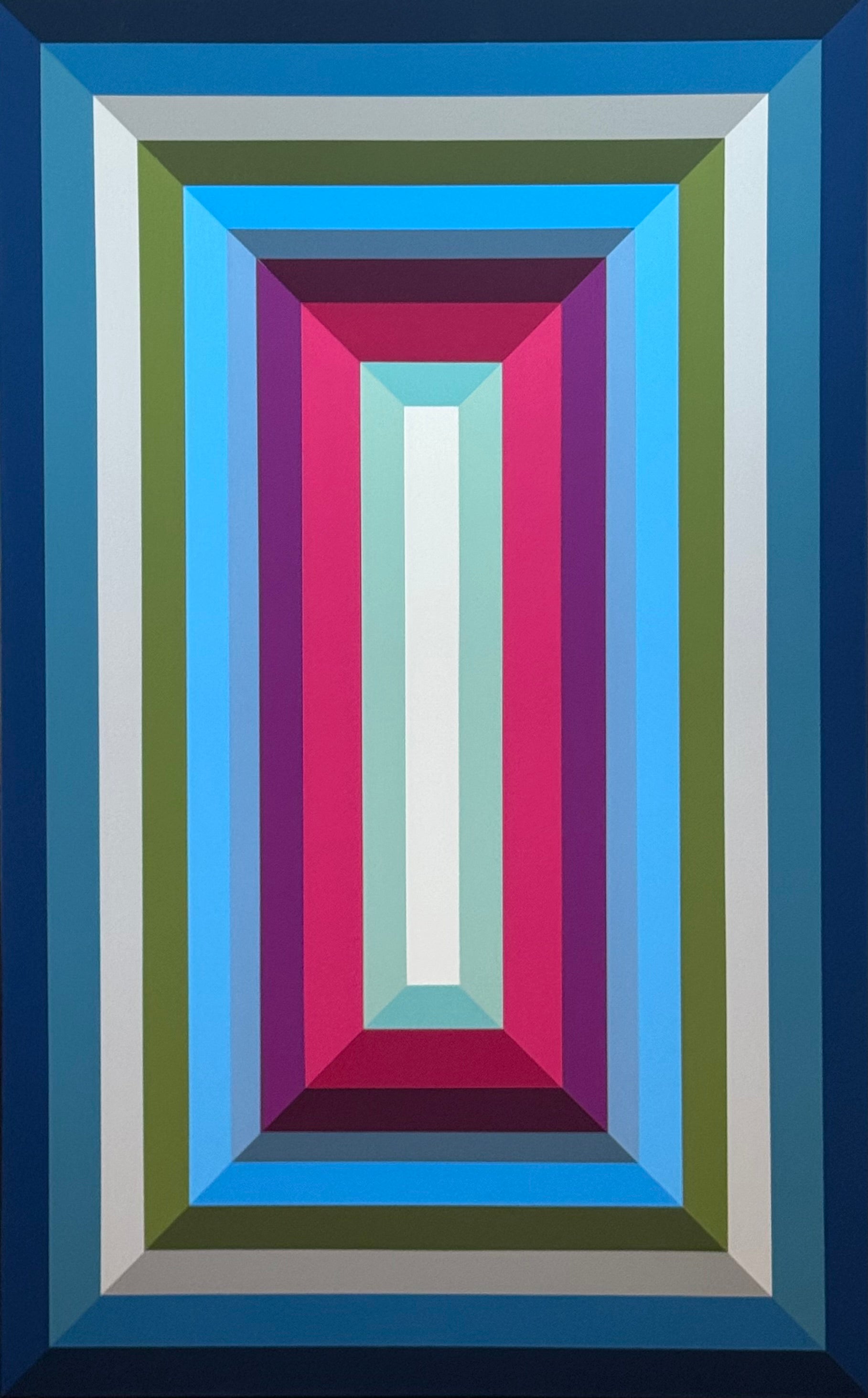 geometric abstract in shades of blues, green and magenta. a 48” x 30” acrylic on canvas.