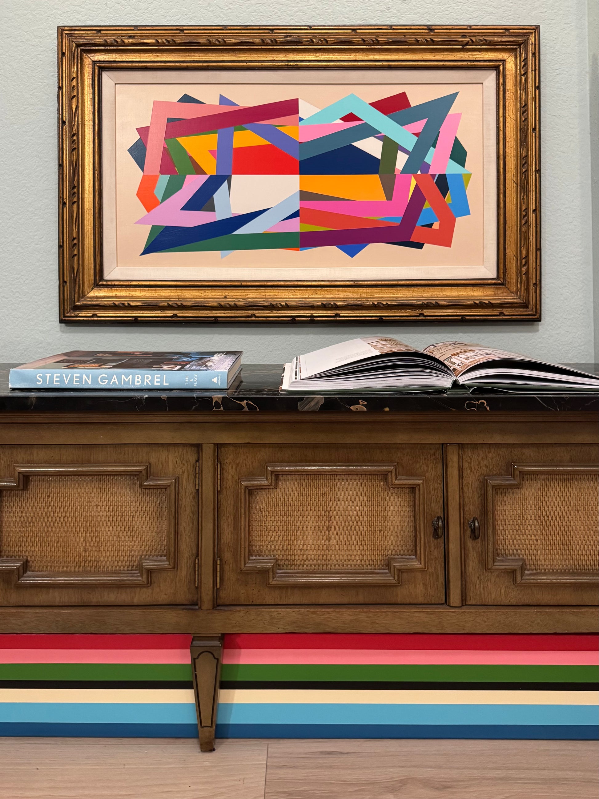 An colorful geometric abstract painted on a 1/2” wood panel placed in a collected vintage frame.