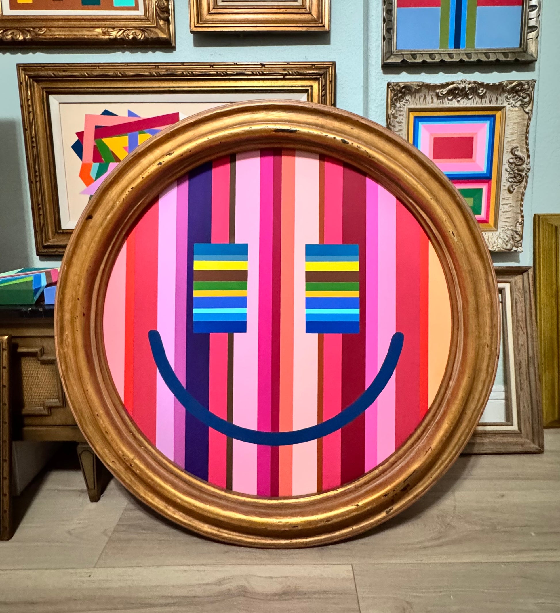 A large round striped abstract, smiley face painting on a 1/2” wood board, in a collected gold vintage frame.